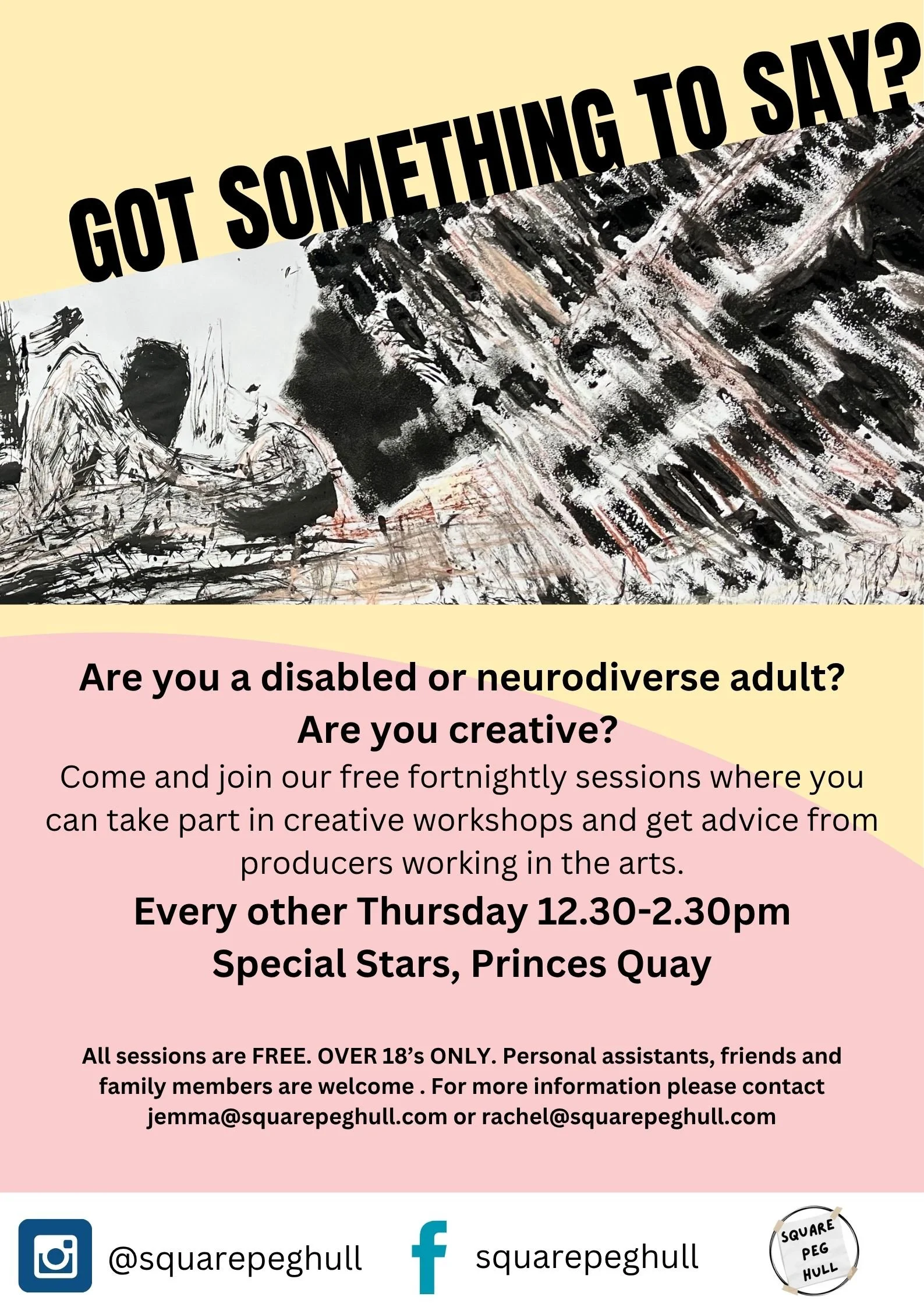 Got Something to Say is a fortnightly art session by Square Peg that takes place at Special Stars in Princes Quay. The group is for disabled and neurodiverse creatives who are looking for their next creative challenge. Square Peg offers guidance such as portfolio creation, support with funding and exhibitions. You are welcome to bring friends, family members and PA’s with you to the sessions.